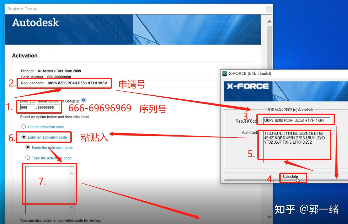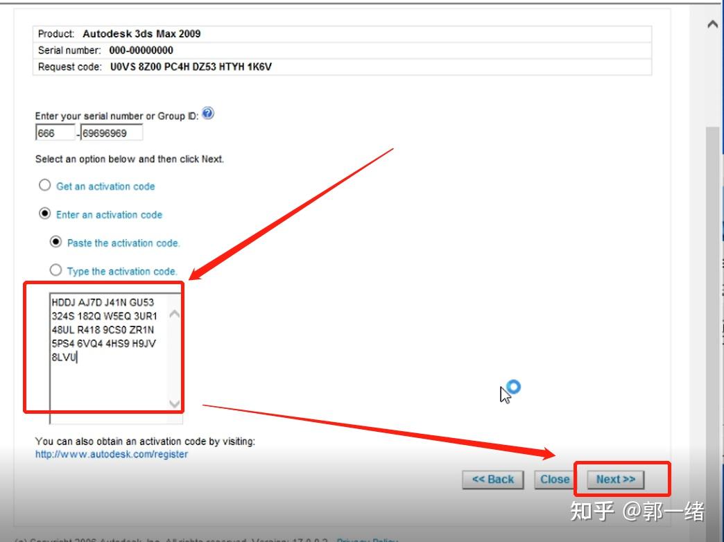 21、进入到激活界面后,输入序列号666-69696969,然后复制申请号到注册机,点击Calculate(计算),将激活码复制到粘贴区域,点击下一步,