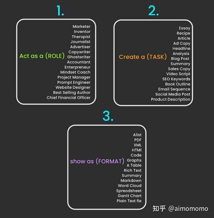 This is one of the easiest and most effective ways to use ChatGPT (这是使用 ChatGPT 最简单、最有效的方法之一),这篇文章就画了一张图,讲了最有效提示词一般涉及到的三个模块:角色扮演,创建一个任务,以及展现形式的格式化,这也是我对之前看到的所有提示词案例的一个整体印象.