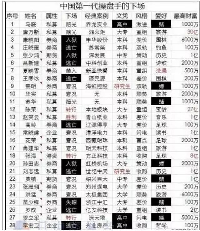 逍遥刘强所提到的一个宿舍全军覆灭,这种宿命性的结局,很容易让人想起另两个统计数据: 中国第一代操盘手下场。