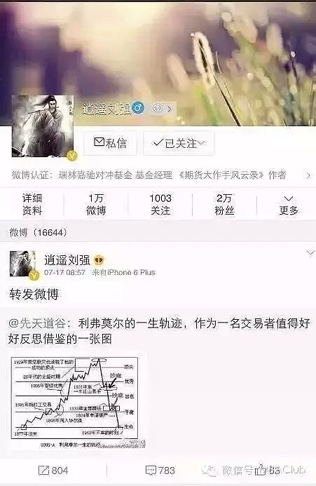 上图为股灾后,也是刘强生前最后一条微博,所转发的是股神利弗莫尔一生轨迹图,利弗莫尔是上世纪最天才的股神之一,著有《股市大作手回忆录》,利弗莫尔曾经在股市上赢得惊天财富,但仅仅十年之后,便自杀陨落。刘强是利弗莫尔的崇拜者,他的自传体小说《期货大作手风云录》书名亦是向利弗莫尔致敬,从利弗莫尔的结局中,刘强深深悟到在资本市场,赚多赚少不重要,关键是还活着,并写了多篇文章进行阐述,刘强说,利弗莫尔最终自杀身亡的结局总让人扼腕叹息。当一个人的信仰不足以支撑他的巨大欲望之时,走火入魔就是他的不归之路。过于自信的性格,放荡不羁的私生活,以及对风险控制的一再放纵,再加上美国百年不遇的经济危机,让利弗莫尔最终走向了灭亡之路。时也运也命也!