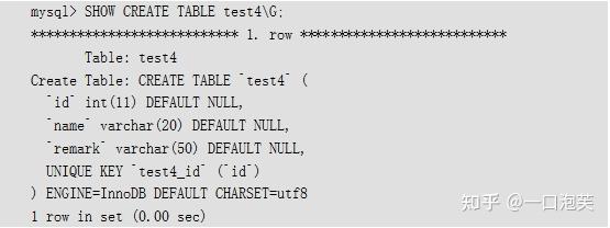 以上执行结果证明test4表的id字段的唯一索引创建完成。为了进一步验证,使用SHOW CREATE TABLE查看表的具体信息。