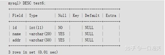 以上执行结果证明test6表中的id字段添加非空约束成功。为了进一步验证,使用DESC语句查看表结构。
