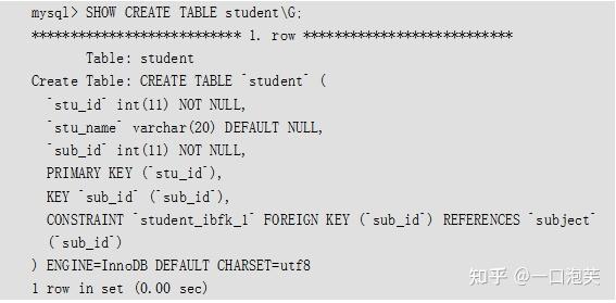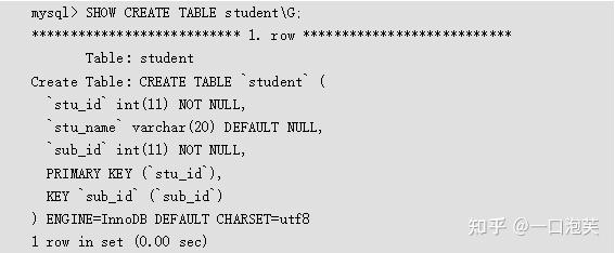 以上执行结果证明student表的外键约束删除成功。为了进一步验证,使用SHOW CREATE TABLE语句查看student表。
