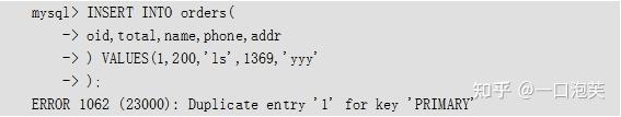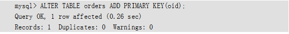 从以上执行结果可看出,orders表中的数据成功插入,该表中此时有两条订单数据,且两个订单的oid都为1。但订单号相同,商品的付款、送货等流程都可能出现问题。为了避免这种问题,在此处可以为表添加主键约束,为已经存在的表设置主键的语法格式如下。