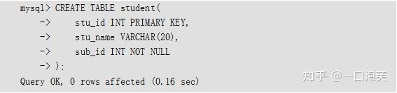 然后创建学生表student,包含3个字段(学生编号stu_id、学生姓名stu_name和专业编号sub_id)。