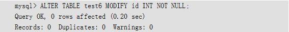 以上执行结果证明test6表创建完成。接着为表中的id列添加非空约束。