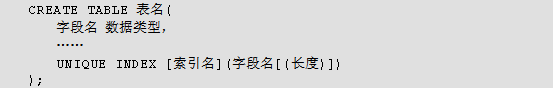 在以上语法格式中,UNIQUE INDEX关键字表示唯一索引,索引名是可选值,括号中的字段名是创建索引的字段,参数长度是可选的,用于表示索引的长度。