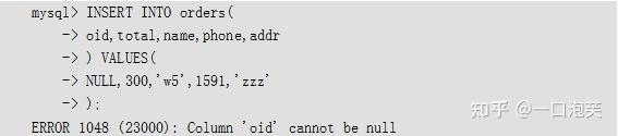 从以上执行结果可以看出,当oid的值不重复时插入成功。另外,主键的值不能为NULL,此处继续验证,向表中插入一条数据,将oid设置为NULL。