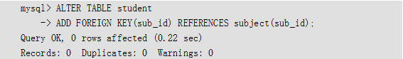 以上执行结果证明subject表中的数据删除成功,这就是外键约束的基本使用。用户除了创建表后添加外键约束,还可以在创建表的同时添加外键约束。