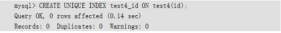 从以上执行结果可以看出,id字段成功创建了唯一索引,索引名称为test4_id。