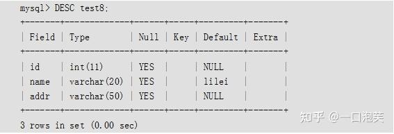 以上执行结果证明test8表中的name字段添加默认值约束成功。为了进一步验证,使用DESC语句查看表结构。