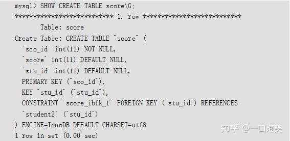 以上执行结果证明score表创建成功,在创建的同时添加了外键约束。为了进一步验证,使用SHOW CREATE TABLE语句查看score表。