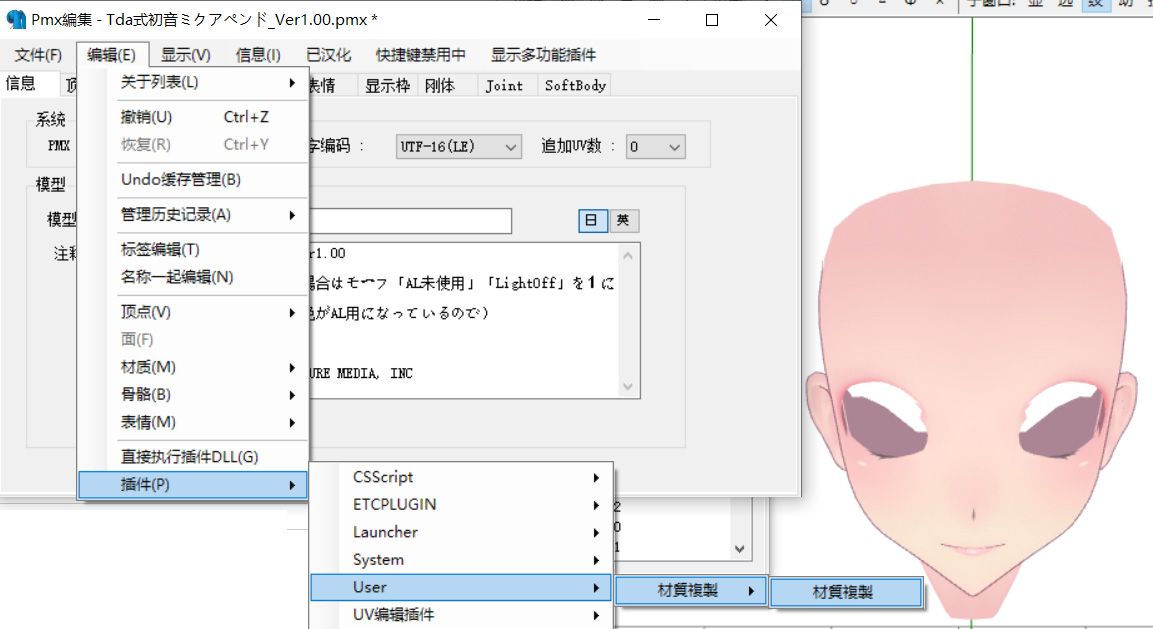「编辑」-「插件」-「User」-「材質複製」-「材質複製」