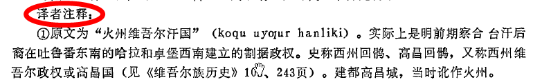 显然,译者把跟喀喇汗王朝同期的高昌回鹘汗国qochu uyghur hanliqi跟后来的火州国qochu hanliqi给弄混了。其实这是十分正常的事,由于中亚的语言和中原不一样,地名政权名称人名重复的多,一不小心可能弄混。正规官方史书《明史》对中亚记载里也存在很多误区,何况个人弄混个概念有什么。