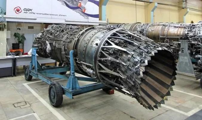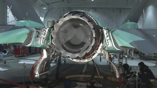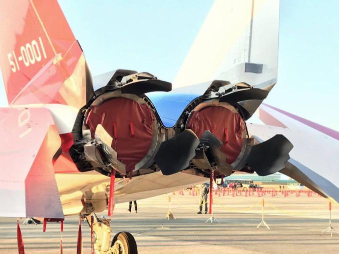 这是俄罗斯T-50战机换装的新型发动机“产品-30”涡扇发动机,采用的是同轴三维推力矢量尾喷管,锯齿状的末端扩敛片具备一定的隐身能力。