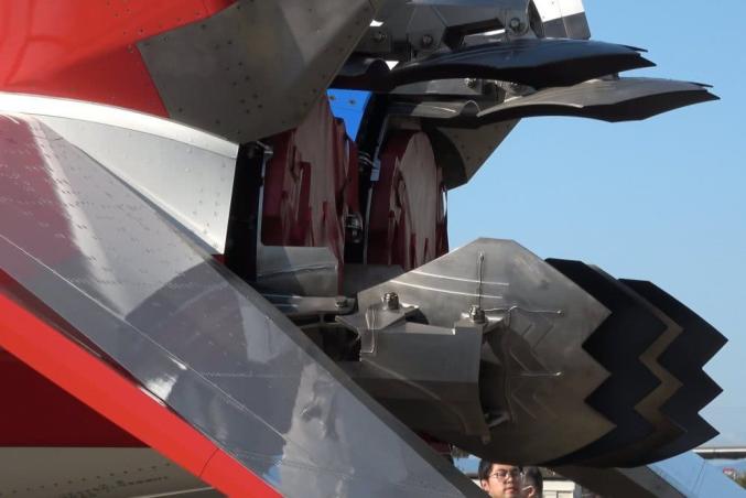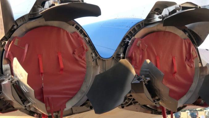 从侧面看,“心神”的折流板还部分运用了隐身修形,采用锯齿设计。折流片内侧据称为耐高温钛合金材料,上面分布了几处传感器,用来测量喷流压强速度等参数,供后续研究使用。