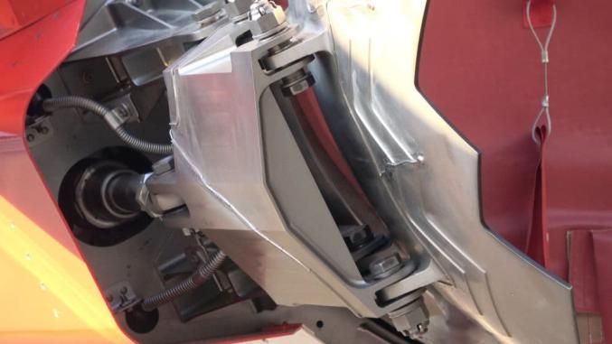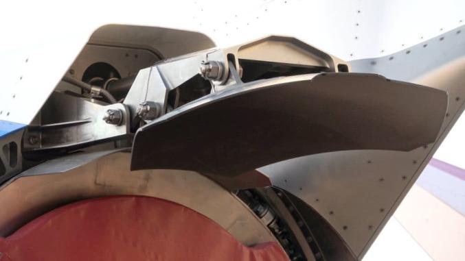折流板部件特写,机体内伸出液压作动筒,驱动折流片在一定角度内活动。可以看出金属部件的表面处理工艺还是很不错的,从外侧经过的线缆也被金属焊接包覆固定。