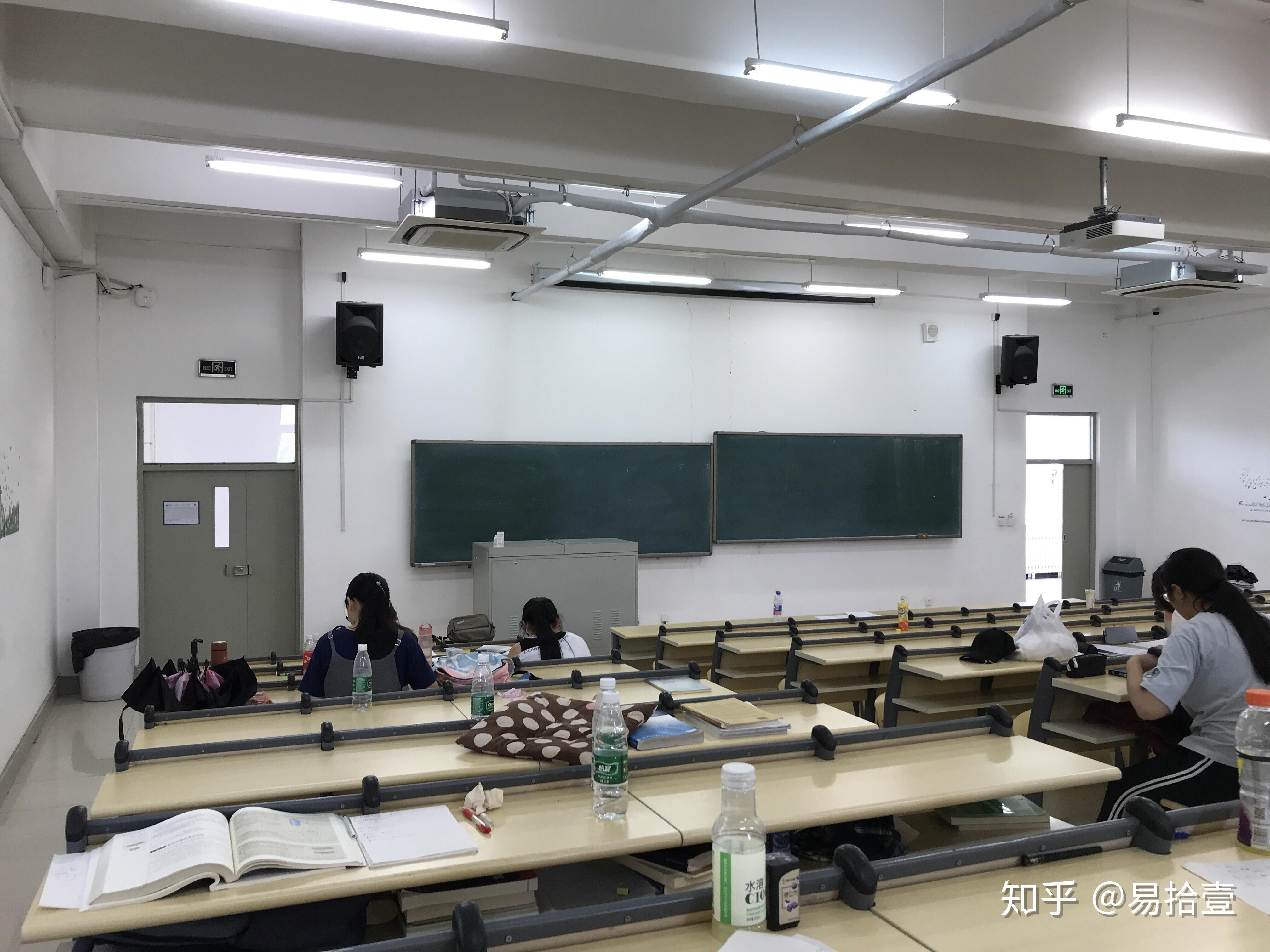 acb座彼此相连,其中ab座有五层楼,c座两层,分平面教室和阶梯教室,通常是四个班合成一个大班一起上课。