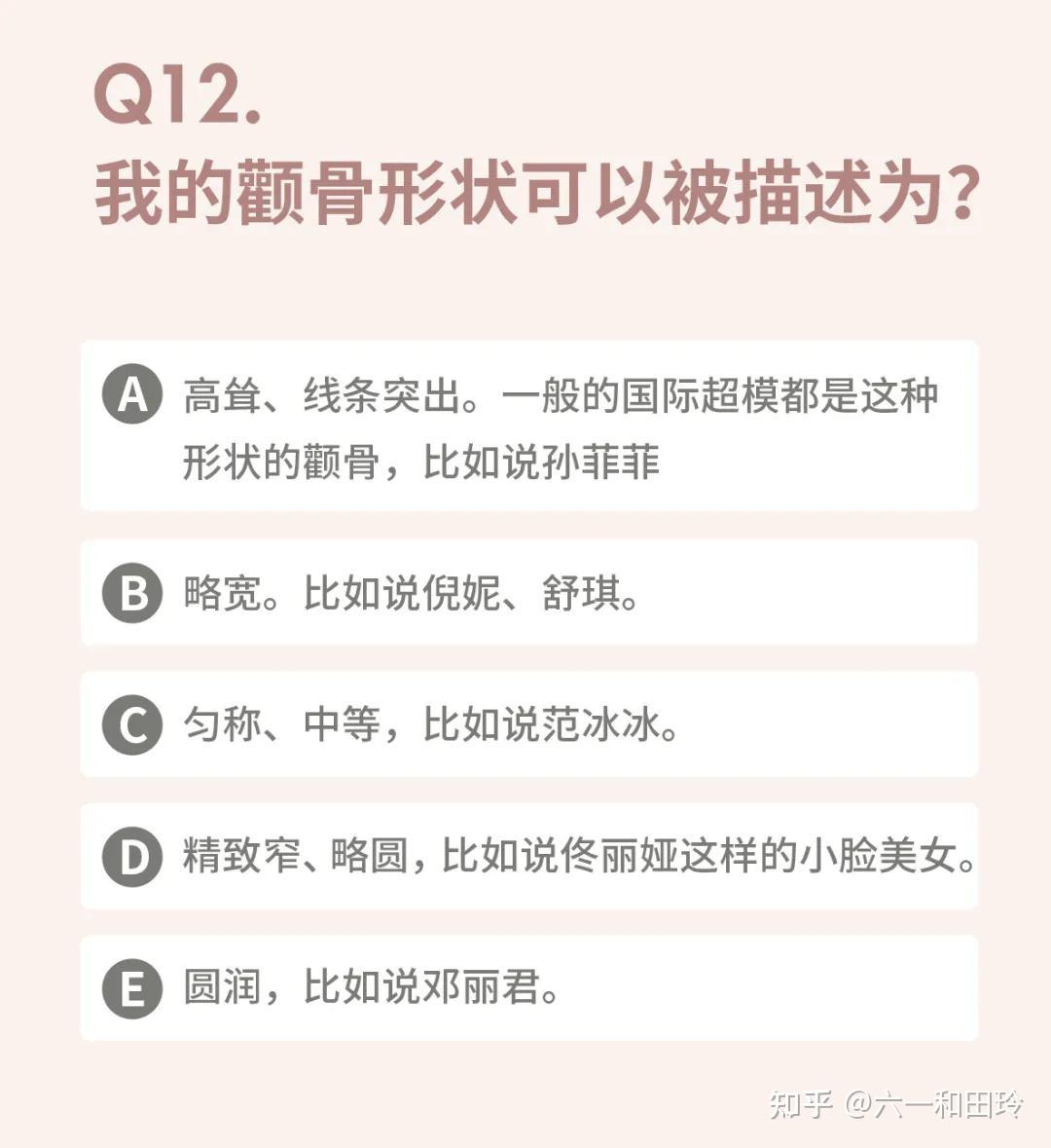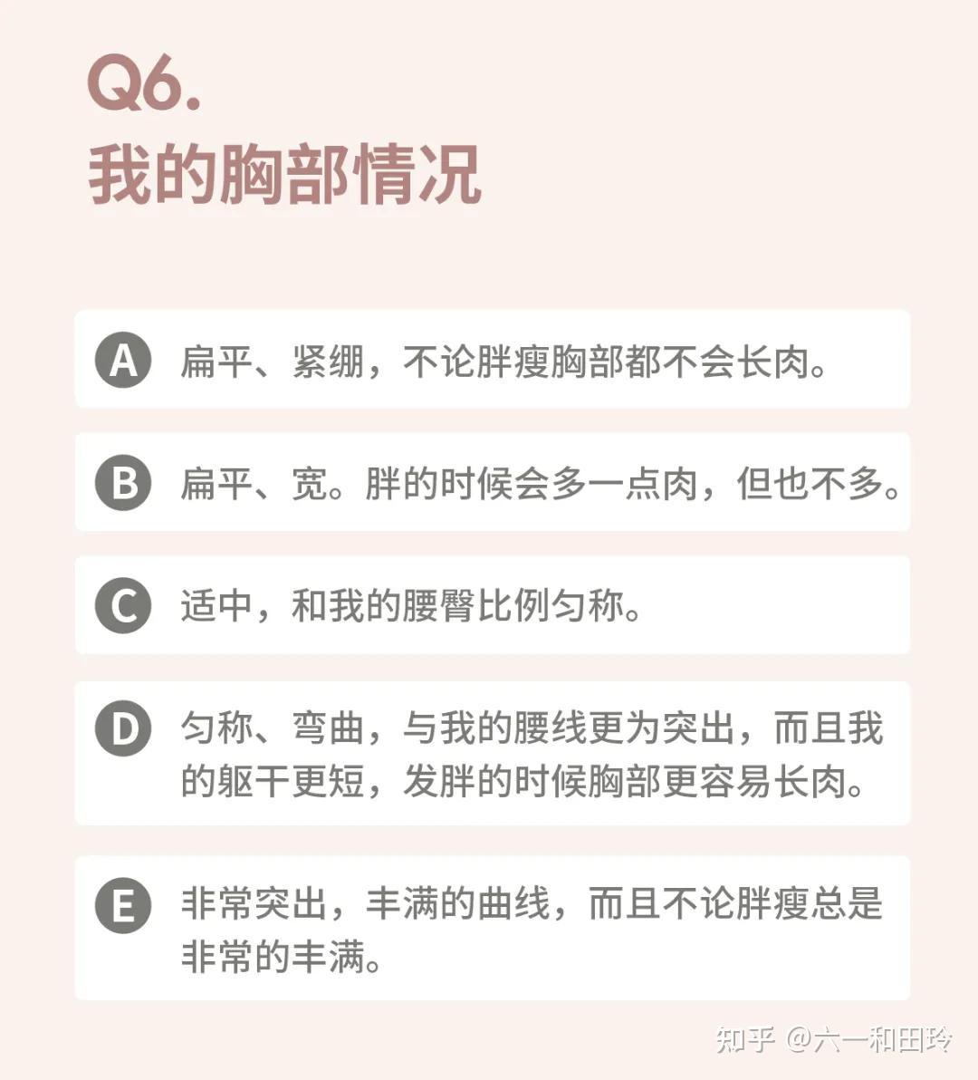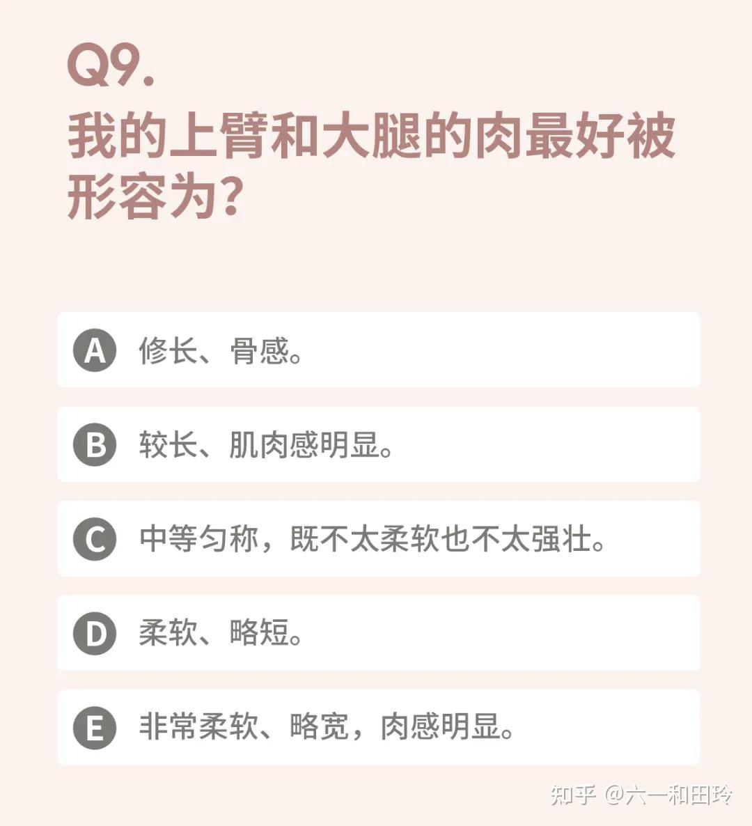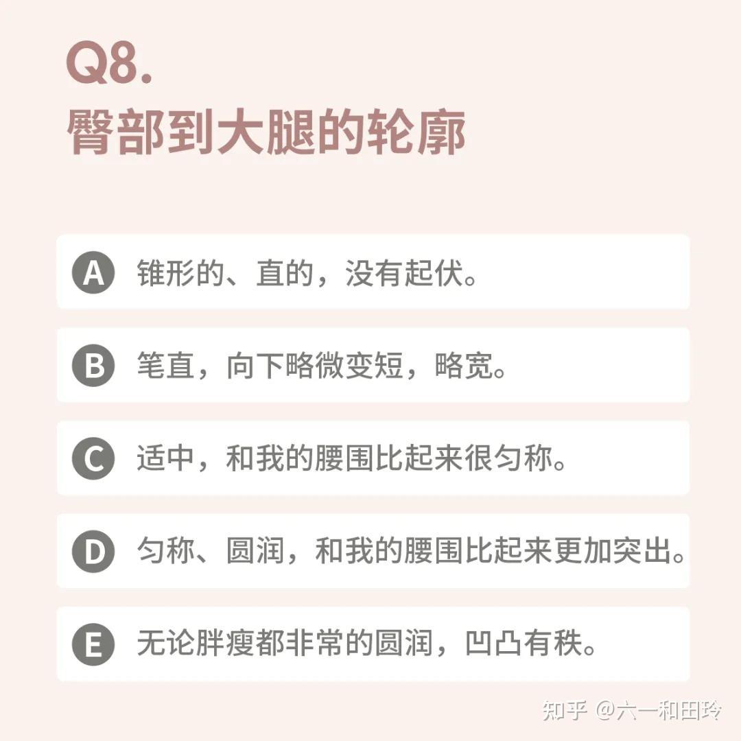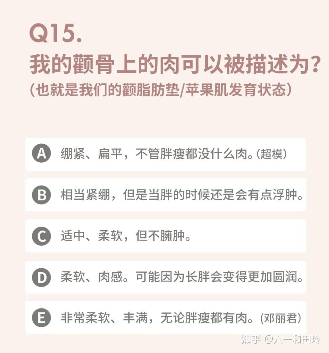 测试下来,我自己大部分选项是D和E,眼睛圆、颧脂肪垫(苹果肌)较发达、肩膀圆、腰腹臀曲线明显,totally 一个 Romantic 窈窕/有料型 。