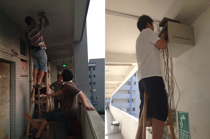 于是我们进入工厂宿舍开启新的模式:找到一家工厂谈妥,工厂不需要任何投入,只要许可我们施工;我们负责所有的硬件投入及宽带费用。下图是我们在工厂宿舍安装路由器及AP的情况,环境已经比之前的咖啡店差了很多,左图中的梯子快散架了摇摇晃晃而且边上就是阳台,所以只好有人扶着操作。我们完成了从城里走向农村的转型,每个人都成为郊县天王,右图中的白衣少年是我们毕业于清华的技术大拿。