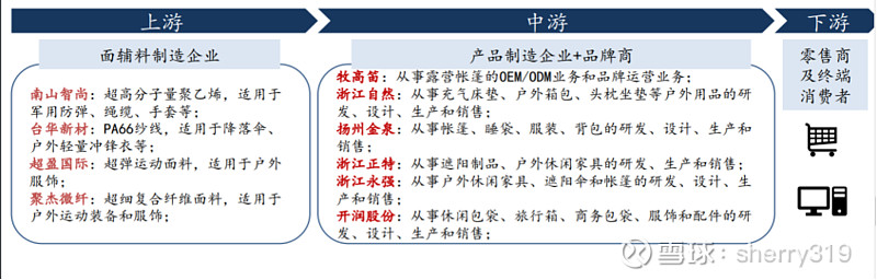 中游 :部分品牌商由自身生产所有产品,部分品牌商则全部或部分通过ODM/OEM方式委托供应商为其制造相应产品。我国户外用品 制造企业多以OEM/ODM起家,具备丰富的代工经验,海外客户稳定。