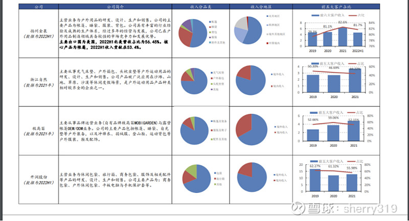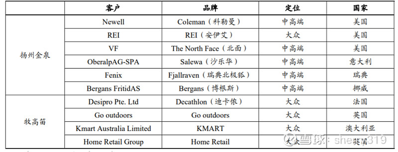从客户结构看: 扬州金泉 主要覆盖中高端客户, 牧高笛 外销客户多定位大众赛道。 扬州金泉主要合作品牌客户包括中高端户外用品品牌商 Coleman、The North Face、 Salewa、Fjallraven、Bergans 以及大众品牌零售商 REI。2019-2021 年前六大客户较为稳 定、销售额贡献近 80%左右。牧高笛 OEM/ODM 客户多定位大众赛道,包括大众专业 户外用品品牌迪卡侬、Go outdoors,普通零售商 KMART、Home Retail 等,其中迪卡 侬为第一大客户,2021 年贡献牧高笛外销总营收 51%。