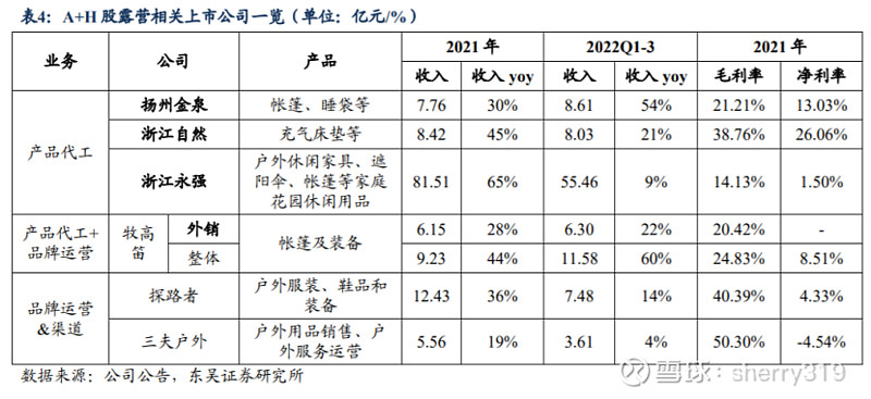 目前 A+H 股露营相关上市公司主要有 扬州金泉 、 牧高笛 、 浙江自然 、 浙江永强 、 三夫户外 、探路者。从产业链角度看,三夫户外、探路者业务以品牌运营&渠道为主; 扬州金泉、浙江自然、浙江永强主要布局国外产品代工制造,牧高笛同时布局国外产 品代工制造+国内品牌运营。 代工制造分产品看,扬州金泉、牧高笛以帐篷等入门露营装备为主,浙江自然以 充气床垫等较为进阶的装备为主,浙江永强以家庭花园休闲用品为主。可以看出,露 营相关上市公司中,同样布局产业链中产品制造的牧高笛、浙江自然、浙江永强与扬 州金泉经营模式较为可比。