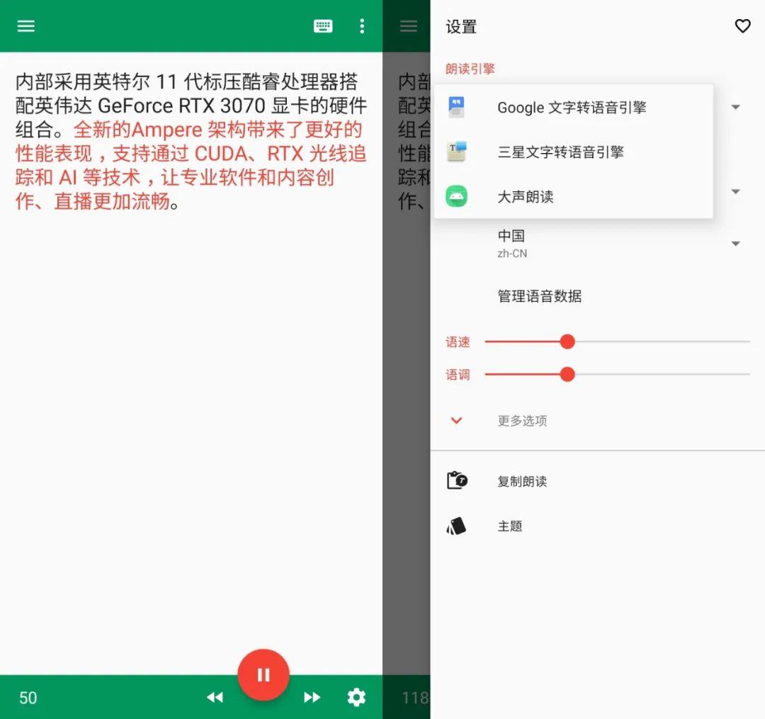 所以如果你是重度听书用户,我们还是建议你使用手机或听书 App 自带的语音引擎,又或是无需网络且兼容性更佳的谷歌语音引擎。