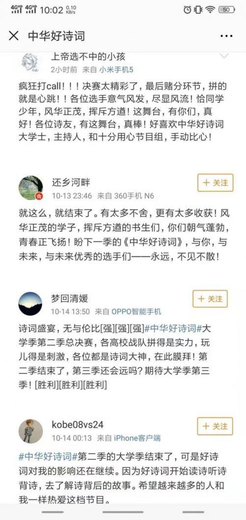 当晚,《中华好诗词》再掀收视热潮,节目在微博热门话题小时榜、综艺榜中均跻身前三,#中华好诗词#及相关子话题微博阅读量突破8.7亿,40多位微博大V为总决赛发声,万千网友给《中华好诗词》微信公众号留言,直呼:“太精彩了,为好诗词疯狂打call!”同时,也有许多粉丝表达了万分不舍之情,憧憬新一季的相遇。