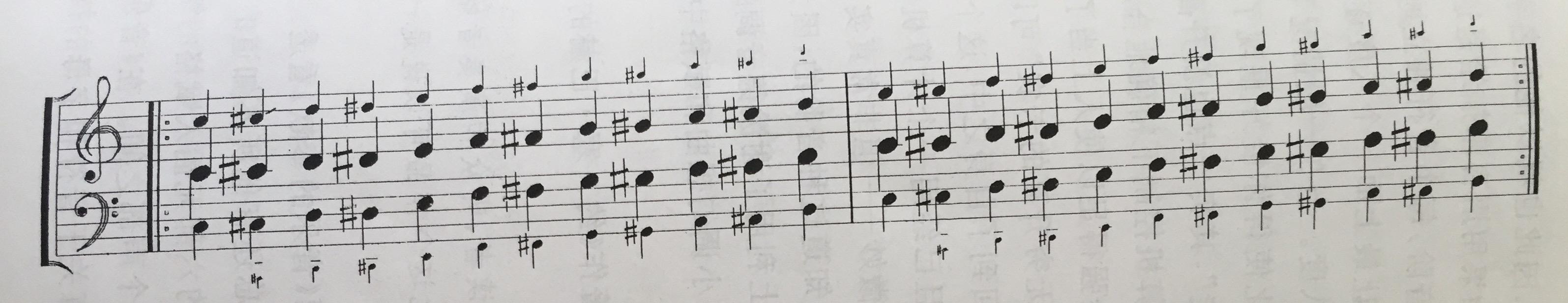 在巴赫的音乐中,最为典型的一个,就是在乐集「音乐的奉献」中「无穷升高的卡农」。在这部卡农中,音调一直在转高,但是到了最后,这个怪圈又绕回了C调,也就是从C->D->E->F#->G#->A#->C,很类似上面艾舍尔的「上升与下降」,越来越高最后又走回了低点。能做到走回原点的原因,是因为他试用了一种叫做「谢泼德音调」的音阶处理方式,示意图如下: