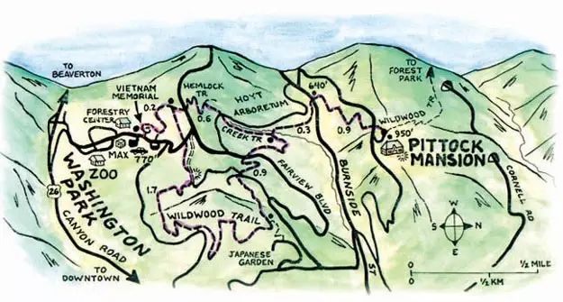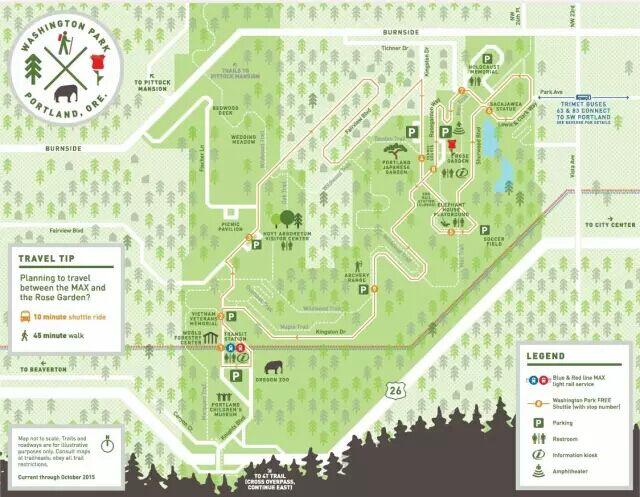 华盛顿公园坐落于波特兰西侧一个小山上,园内设有上面提到的国际玫瑰试验及日本花园。此外,公园里还附设有世界森林中心、俄勒冈科学博物馆和动物园。