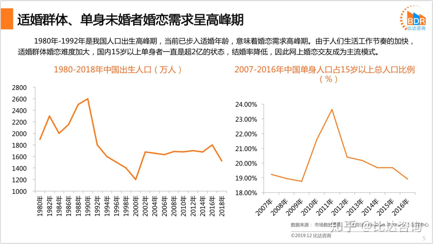 1980年-1992年是我国人口出生高峰期,当前已步入适婚年龄,意味着婚恋需求高峰期。由于人们生活工作节奏的加快,适婚群体婚恋难度加大,国内15岁以上单身者一直是超2亿的状态,结婚率降低,因此网上婚恋交友成为主流模式。