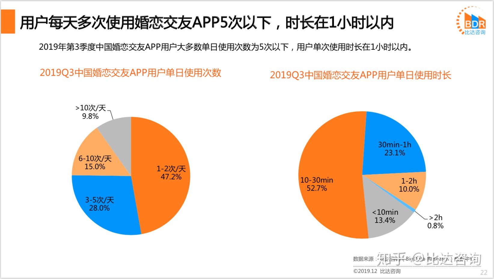 2019年第3季度中国婚恋交友APP用户大多数单日使用次数为5次以下,用户单次使用时长在1小时以内。