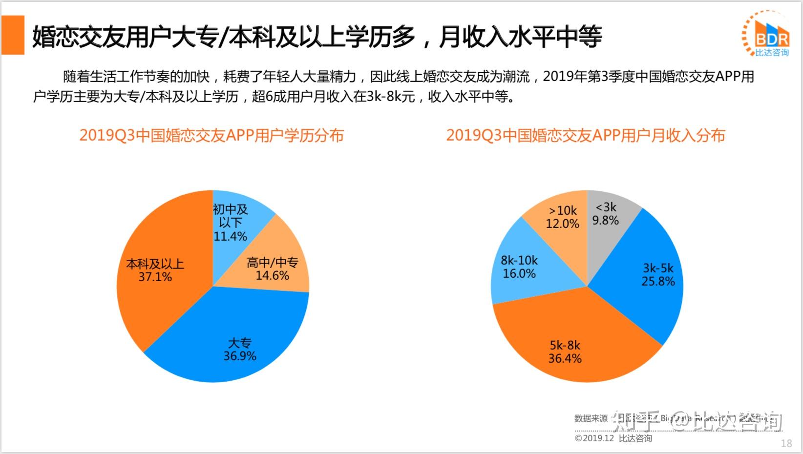 随着生活工作节奏的加快,耗费了年轻人大量精力,因此线上婚恋交友成为潮流,2019年第3季度中国婚恋交友APP用户学历主要为大专/本科及以上学历,超6成用户月收入在3k-8k元,收入水平中等。