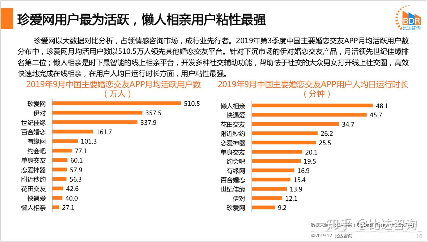 珍爱网以大数据对比分析,占领情感咨询市场,成行业先行者。2019年第3季度中国主要婚恋交友APP月均活跃用户数分布中,珍爱网月均活用户数以510.5万人领先其他婚恋交友平台。针对下沉市场的伊对婚恋交友产品,月活领先世纪佳缘排名第二位;懒人相亲是时下最智能的线上相亲平台,开发多种社交辅助功能,帮助怯于社交的大众男女打开线上社交圈,高效快速地完成在线相亲,在用户人均日运行时长方面,用户粘性最强。