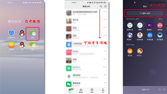 步骤1.打开你的微信(手机端),进入微信的首页,随后下拉你的首页顶部,然后会发现你常用的小程序都显示在这里,我们点击上方搜索框;
