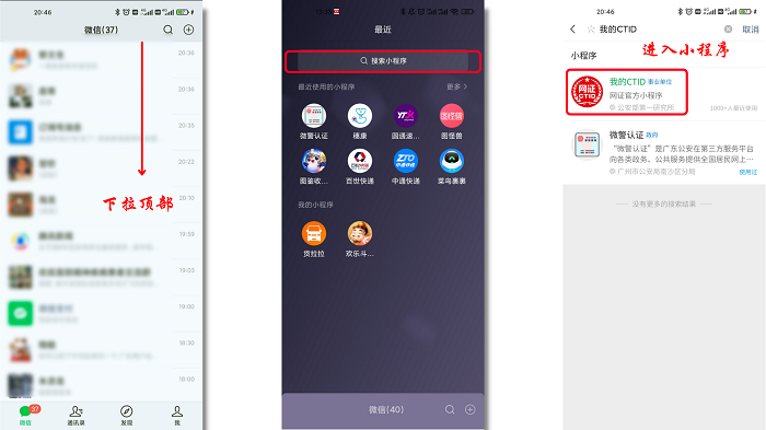 第1步:打开微信后下拉首页的顶端,然后进入搜索框,输入“我的DTID”后进入这个小程序;