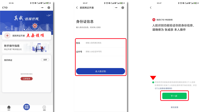 第2步:来到小程序的首页后,第一次我们都是要先进行信息完善的,登录后点击“居民网证开通”,输入自己的姓名及身份证号,进行完人脸识别就OK了!