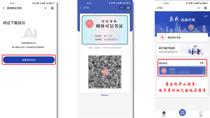 第3步:人脸识别完成后,马上查看我的网证,你的电子身份证二维码就生成了,重新打开首页也可以看到你认证过的都已经下载完成!