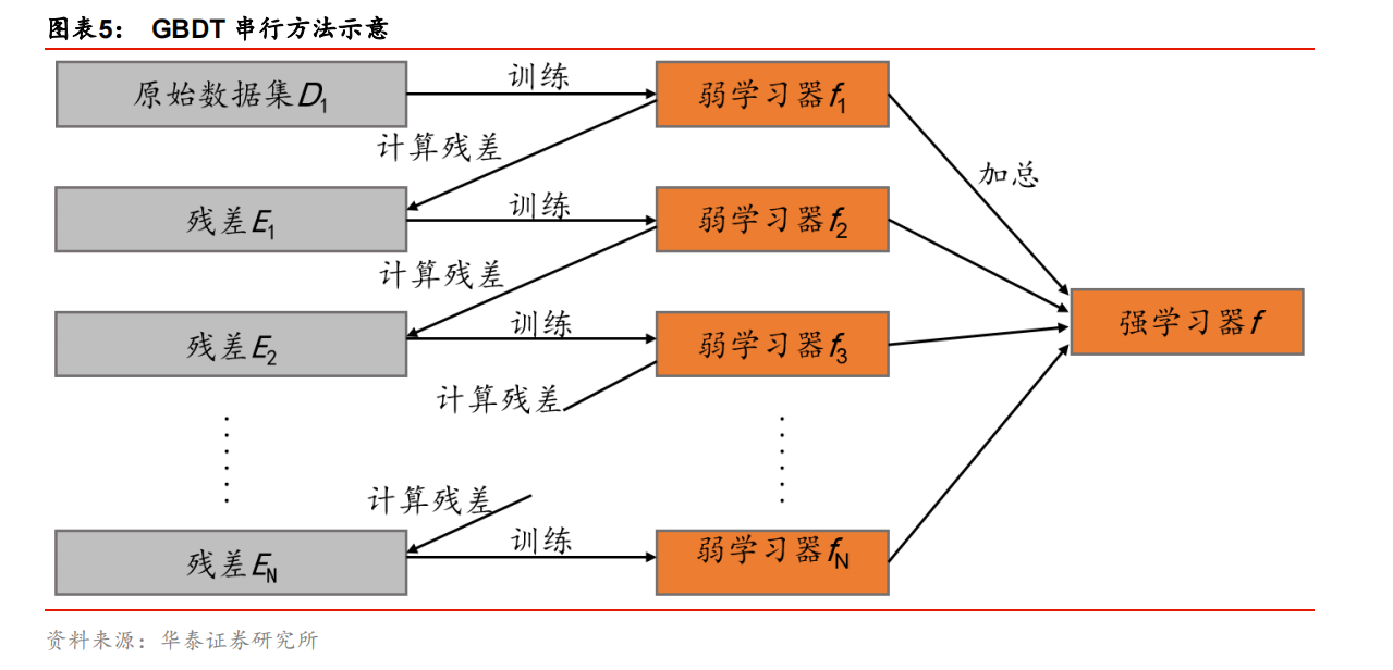 GBDT 的思想可以用一个通俗的例子解释,假如某人有 170 厘米身高,我们首先用 160厘米去拟合,发现残差有 10 厘米,这时我们用 6 厘米去拟合剩下的残差,发现残差还有4 厘米,第三轮我们用 3 厘米拟合剩下的残差,残差就只有 1 厘米了。如果迭代轮数还没有完,可以继续迭代下去,每一轮迭代,拟合的身高残差都会减小。图表 5 显示了 GBDT算法的流程。