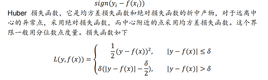 Huber 损失函数,它是均方差损失函数和绝对损失函数的折中产物,对于远离中心的异常点,采用绝对损失函数,而中心附近的点采用均方差损失函数。这个界限一般用分位数点度量。损失函数如下