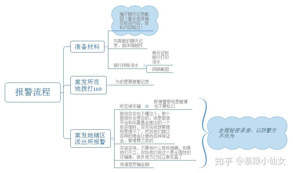 下面给大家说说,如果遇到这样的诈骗怎么办,第一,止付;第二,报警。虽然不指望警察能帮上多大的忙,但是只有报警才有希望破案。给大家放一张报警流程图,帮助被骗的人更好的报警和立案。