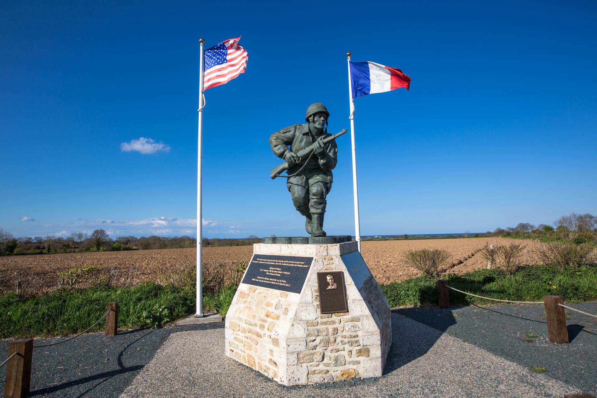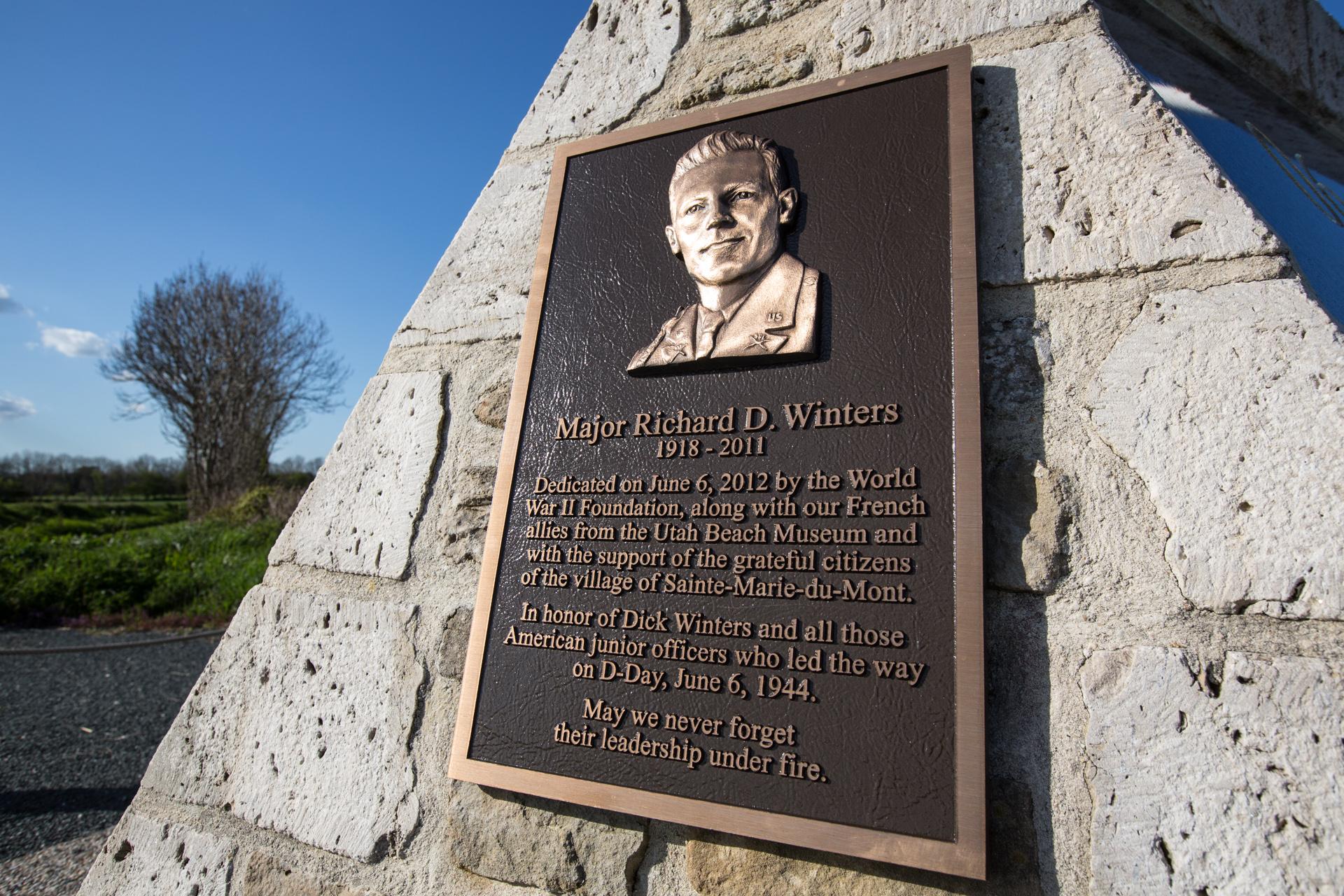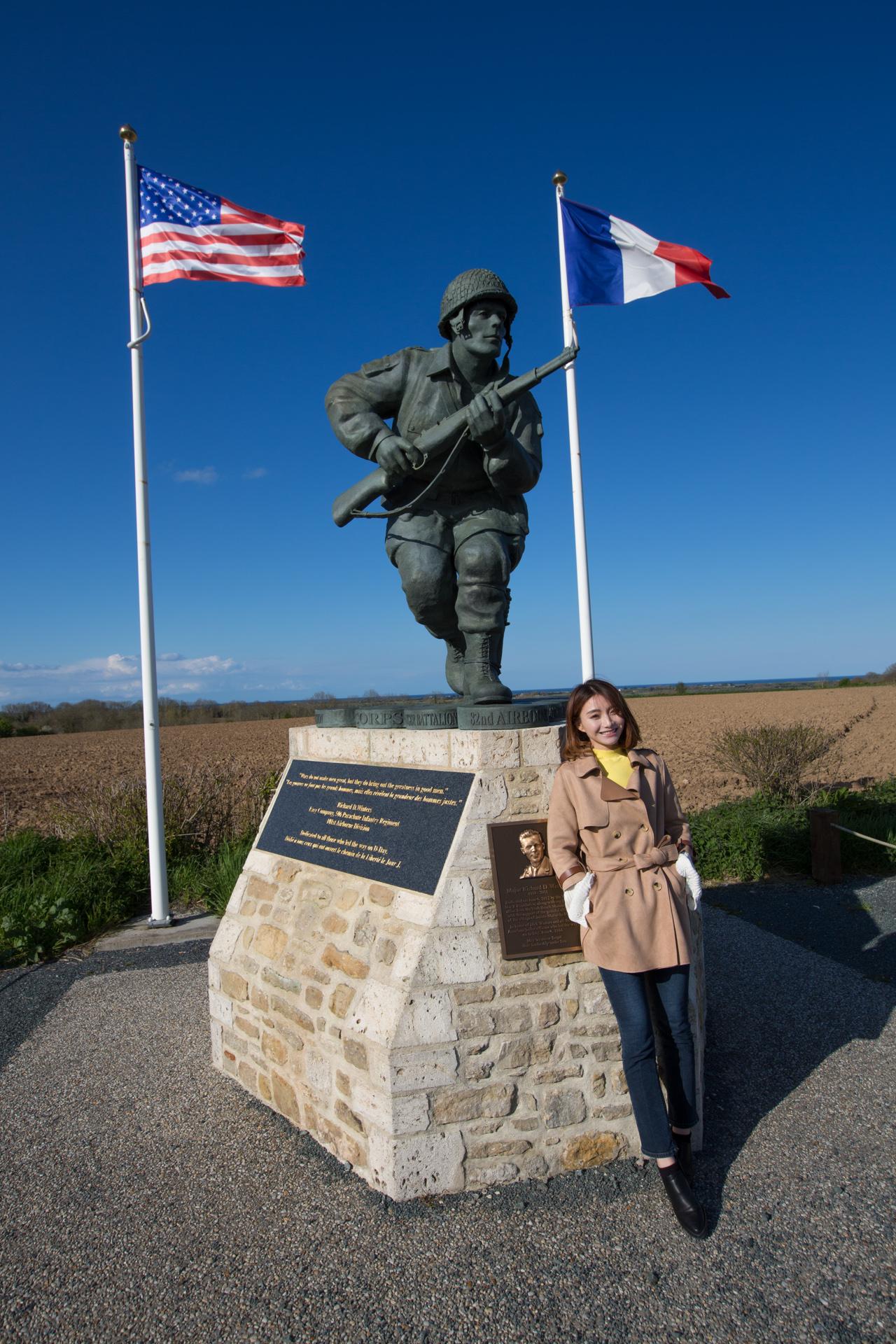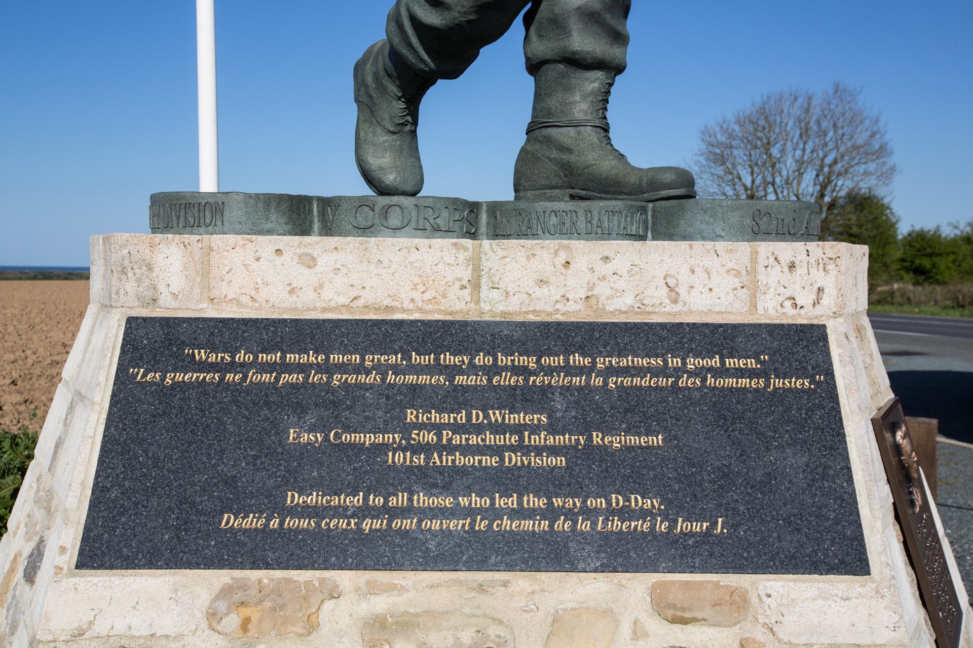诺曼底地区沿途众多雕像,许多都是当时取得丰功伟绩的军官或士兵。往来匆匆我们都不作停留,然而有一个雕像,我们非要去看一看不可,这便是E Company核心人物——温特斯少校!