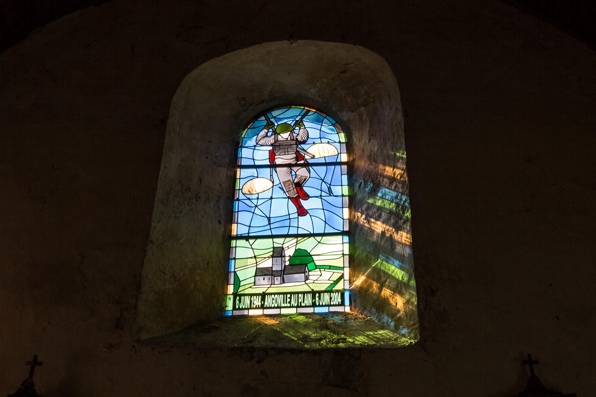 在一个叫做Angoville au Plain的小镇中央,我们见到了熟悉的代表101空降师的山鹰徽章和伞兵像,事实上,这是一个没有名字的教堂里彩色玻璃描绘的画面。诺曼底登陆时,101空降师因德军炮火攻击和天气因素被混乱空投在敌后大片区域,小股部队只能各自作战。这个场景被BOB开头还原:A连小兵赫尔在遇到温特斯之后问:不知道其他人是否和我们一样迷路了。温特斯回答他:我们没有迷路,我们在诺曼底。