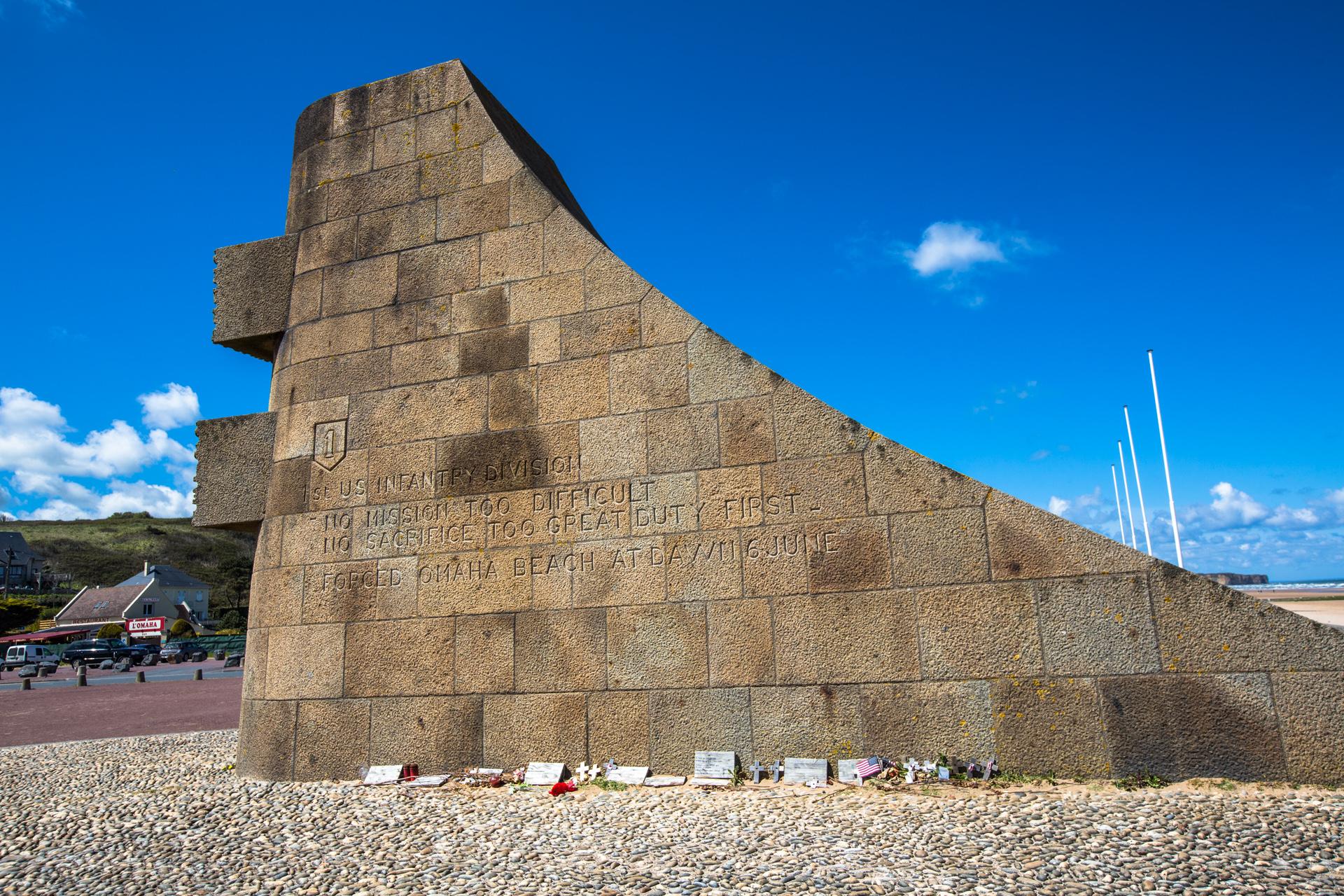 枪林弹雨已然消逝远去,如今海滩边矗立的D-Day纪念碑供人凭吊当年。纪念碑正面以英法两国文字镌刻:“盟军于1944年6月6日在奥马哈海滩登陆以解放欧洲”。右侧则是美军第一步兵师军训:“没有不可完成的任务、没有不可承受的牺牲”——第一步兵师正是当年从东部突进完成奥马哈海滩登陆任务的部队。