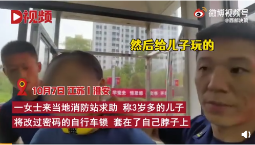 中国小康网讯 10月7日,江苏淮安,下午16时许,一母亲来到当地消防站求助,称家中小孩将改过密码的新锁套在了自己脖子上,被卡1个多小时,无法取下。消防员们查看后,立即将毛巾垫在脖子上,使用绝缘剪成功将锁剪断,引发网友热议。