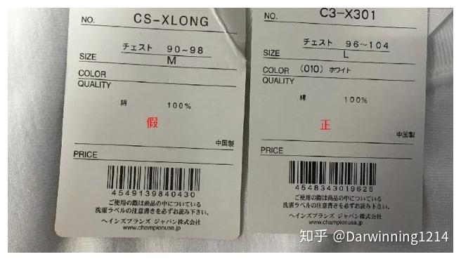 正品吊牌的颜色偏银灰色,印刷更加清晰,黑色白色分色明显,假货是泛黄的。反面,正品吊牌的条形码最后一条线不会超过“社”,正品COLOR 一行有日文,假货是空着的。美版基本款吊牌有三个,日版基本款只有两个。正品冠军衣服标签上应有明确的编号,颜色和尺寸,并且大多数型号的价格栏中也应标有明确的价格。为了省钱,假货会在衣服上贴上许多通用标签,因此这些职位全部或部分为空白。只有在出售时才能贴上标签。还必须注意每列中的描述是否正确,并且与实际对象一致。许多假吊牌类型是随机填写的。例如,重磅t1101短T的吊牌类型应为c5-p301。尺码的型号英文会超过上排数字一点点,假货是对齐的。比较假的会在NO.那排强行加一个型号CS-XLONG。还有些垃圾版本会在吊牌上贴尺码圆贴,正版绝对没有!