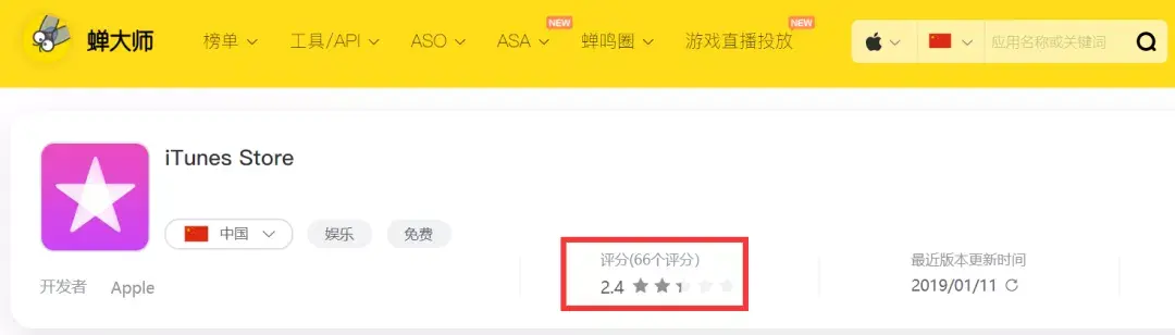 另外,目前风评最差的自带应用当属iTunes Store。根据蝉大师数据显示,iTunes Store目前共计收到66个用户评分,其中一星评分就高达36条,平均得分仅为2.4分。
