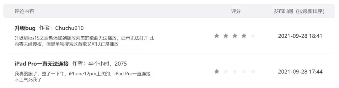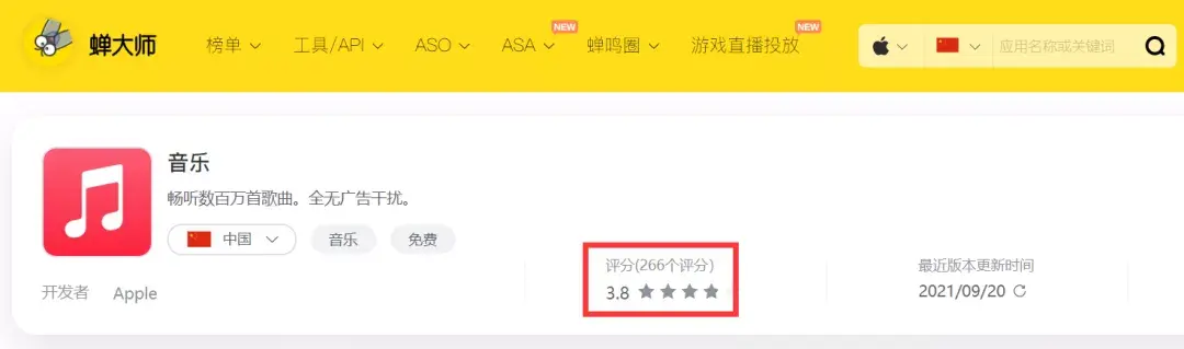 而根据蝉大师数据显示,苹果最受欢迎的自带应用之一Apple Music已经有了266条评分,平均评分为3.8分。而在评论方面,目前呈现两极分化的情况,其中用户抱怨最多的为“连接不上”的问题,希望苹果能收到用户反馈,改进产品体验。