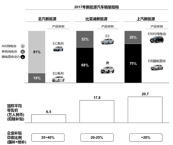 - 北汽新能源依靠纯电动车单条腿走路,比亚迪和上汽则是纯电和插电双条腿一起发展